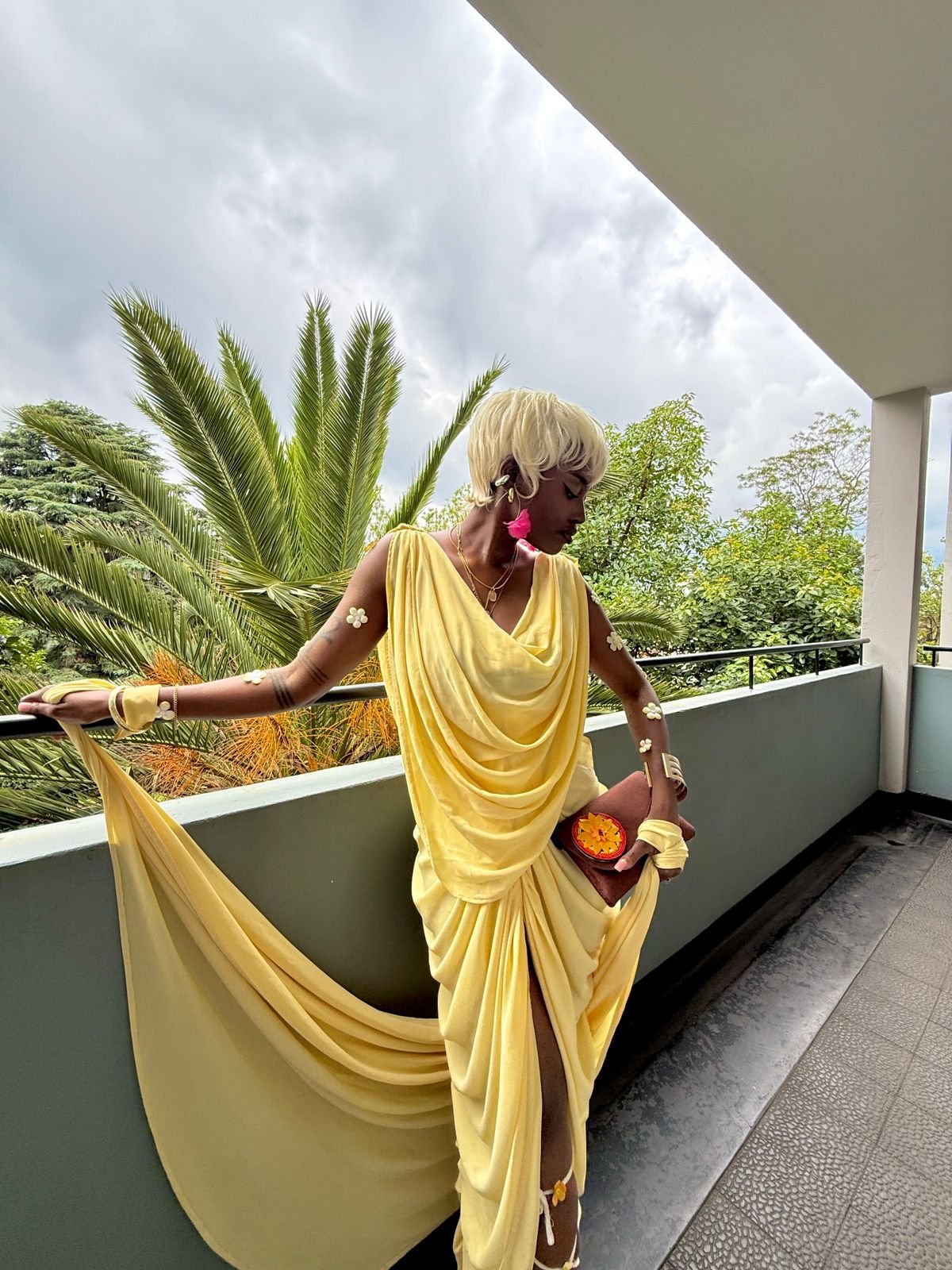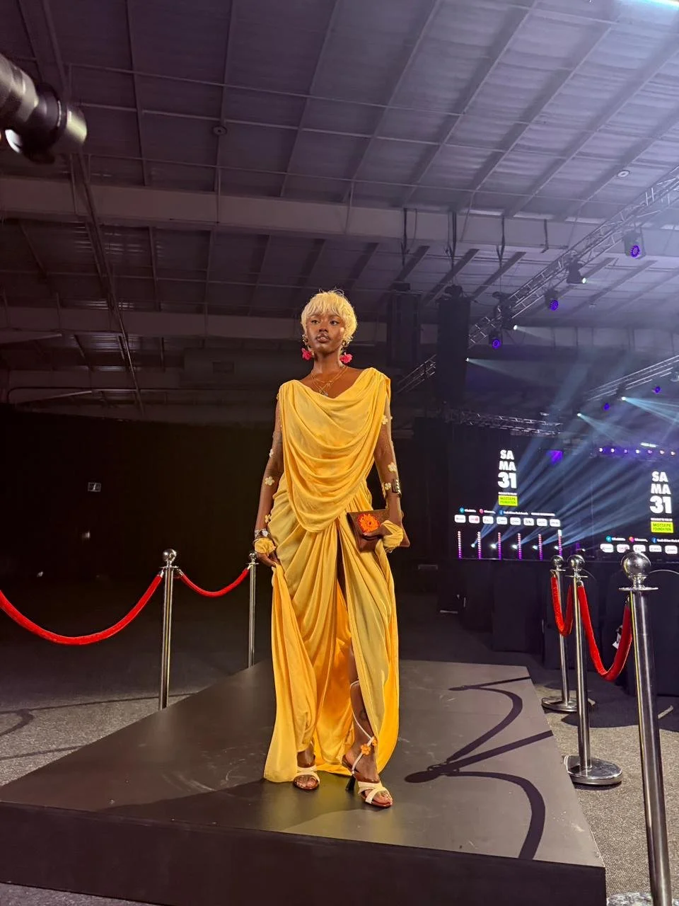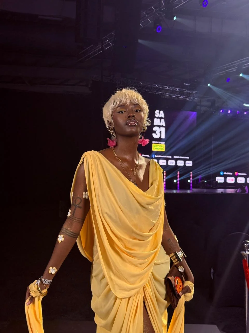 Filah Lah Lah turned heads in a luminous yellow ensemble by Tadiwanashe Karen Kaparipari, leaning into old Hollywood glamour with a romantic, sculptural silhouette. Elegant and striking, the look stood on its own - timeless rather than trend-driven - and cemented Filah’s reputation as an artist with undeniable fashion presence.